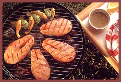 {"ops":[{"insert":"4 salmon steaks, about 1 1/2 pounds (680 g) total, cut about 1 inch (2.5 cm) thick"},{"attributes":{"list":"bullet"},"insert":"\n"},{"insert":"1/2 teaspoon dried dill weed or dried tarragon"},{"attributes":{"list":"bullet"},"insert":"\n"},{"insert":"1 teaspoon each coarsely ground pepper and salad oil"},{"attributes":{"list":"bullet"},"insert":"\n"},{"insert":"2 tablespoons lemon juice"},{"attributes":{"list":"bullet"},"insert":"\n"},{"insert":"1/4 cup (60 mL) scotch or bourbon"},{"attributes":{"list":"bullet"},"insert":"\n"},{"insert":"lemon wedges"},{"attributes":{"list":"bullet"},"insert":"\n"},{"insert":"salt"},{"attributes":{"list":"bullet"},"insert":"\n"}]}